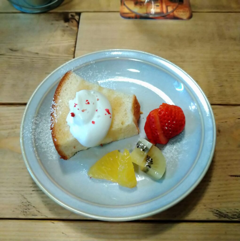 デザートは手作りのシフォンケーキとフルーツです